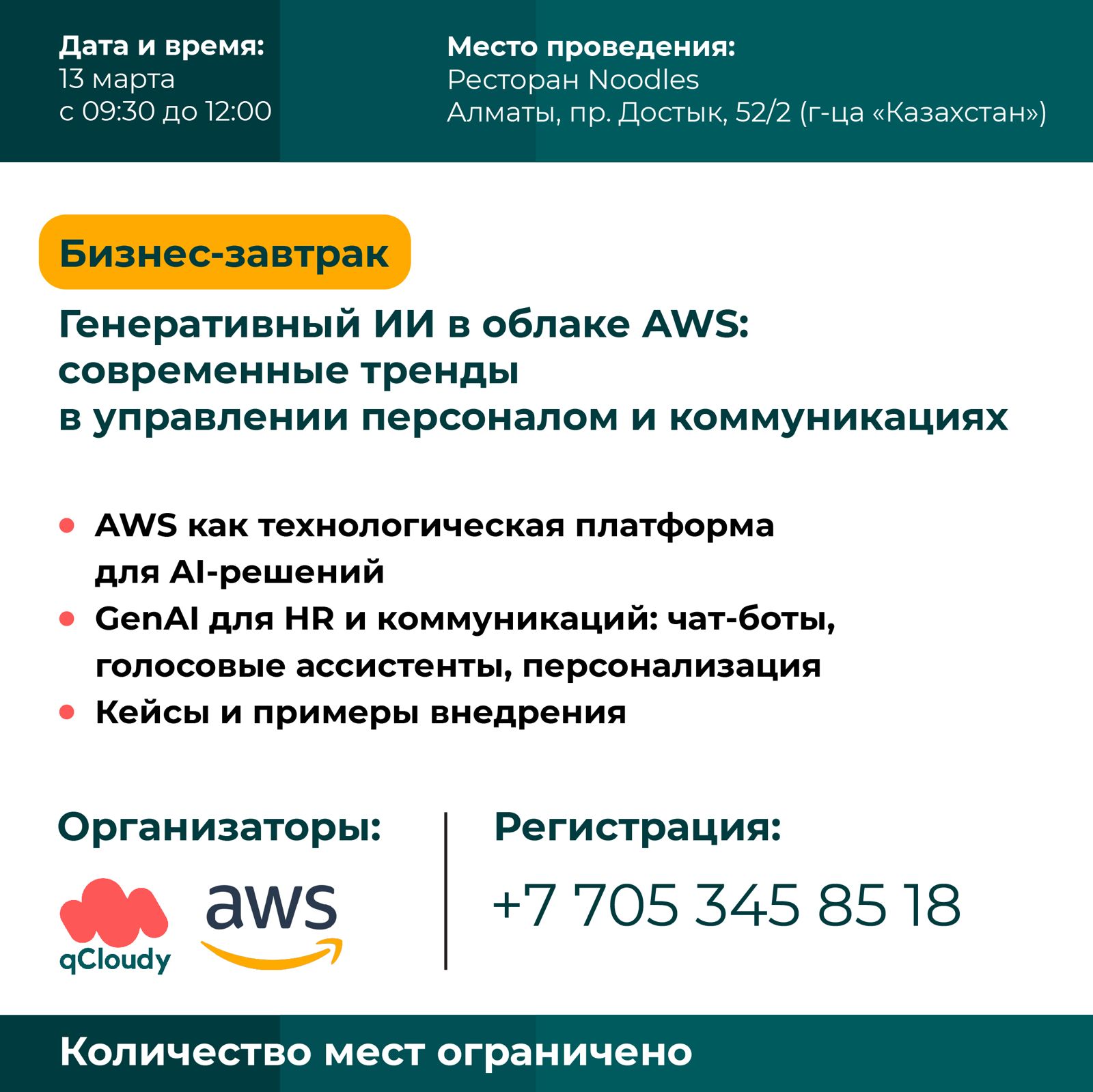 Сегодня в Алматы AWS и qCloudy собрали HR-менеджеров и руководителей, чтобы обсудить, как генеративный искусственный интеллект меняет подход к управлению персоналом и корпоративным коммуникациям.